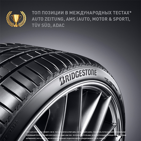 Победитель и призер международных тестов Auto Zeitung, AMS (AUTO, MOTOR &SPORT), TÜV SÜD и ADAC (№1 в 2019 г. и №2 в 2020 годах, №2 и №3 в 2022 г.). Turanza T005 продемонстрировала высокие показатели торможения и управляемости на мокром и сухом покрытии.1
